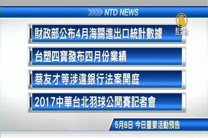 【新唐人亞太台 2017 年 05 月 08 日訊】接著看到,今天,5月8日,星期一 ,有哪些重要活動。首先是,財政部公布4月海關進出口統計數據;再來是,台塑四寶發布四月份業績;兆豐金前董事長蔡友才等涉違法核貸案開庭 ;以及,2017中華台北羽球公開賽記者會,將公布世大運選手名單。