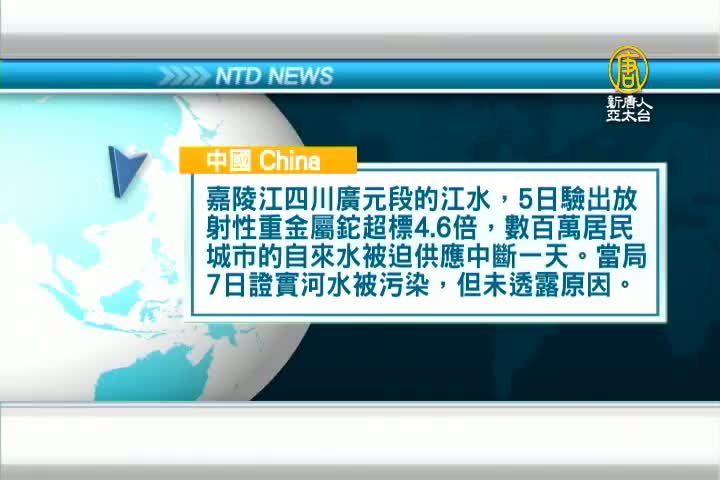 嘉陵江四川廣元段的江水,5日驗出放射性重金屬鉈超標4.6倍,數百萬居民城市的自來水被迫供應中斷一天。當局7日證實河水被污染,但未透露原因。