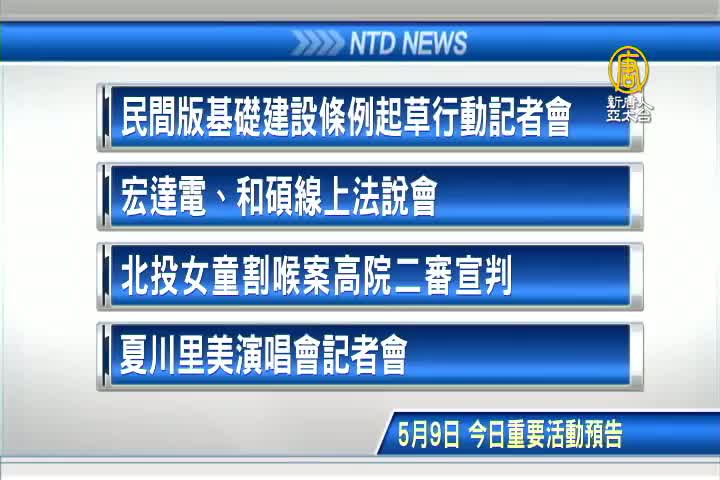 【新唐人亞太台 2017 年 05 月 09 日訊】接著看到,今天,5月9日,星期二 ,有哪些重要活動。首先是,民間版基礎建設條例起草行動記者會;財經消息,宏達電、和碩線上法說會;再來是,北投女童割喉案高院二審宣判;以及,夏川里美演唱會記者會。