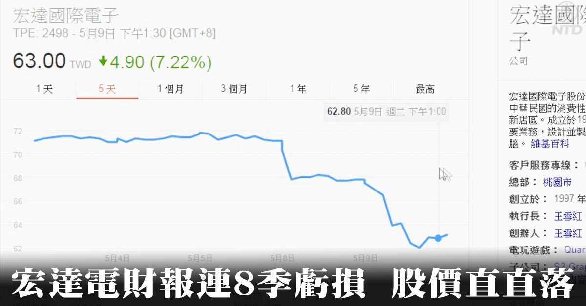 宏達電股價,4月營收月減9.4%,周一股價跌破70元關卡,周二更大跌7.2%,收在63元。宏達電並公布2017年首季,1~4月合併營收192.4億元,年減6.5%,稅後虧損達20億元,每股虧2.47元,已經是連續八季虧損。