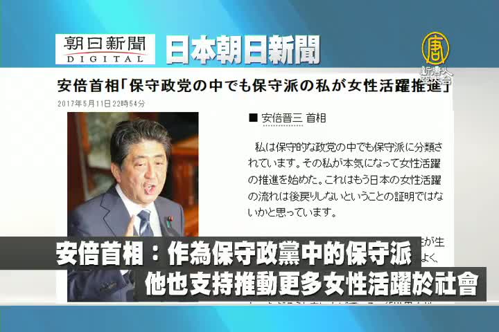 【新唐人亞太台 2017 年 05 月 12 日訊】來看到日本朝日新聞:日本首相安倍晉三表示,作為保守政黨中的保守派,他也支持推動更多女性活躍於社會當中。
