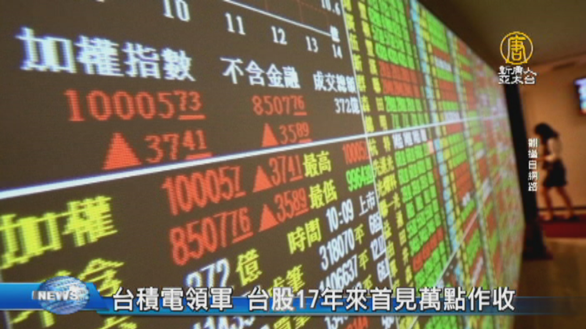 【新唐人亞太台 2017 年 05 月 12 日訊】睽違17年,台股昨天收盤再站上萬點大關。台股昨天在台積電領軍下,盤中加權指數再站上萬點關卡,最高達10018.79點,震盪後以10001.48點作收,成交值964億元。新台幣匯率也受到台股萬點激勵,終場以30.215元兌1美元作收,升值5.1分,終結連2貶。