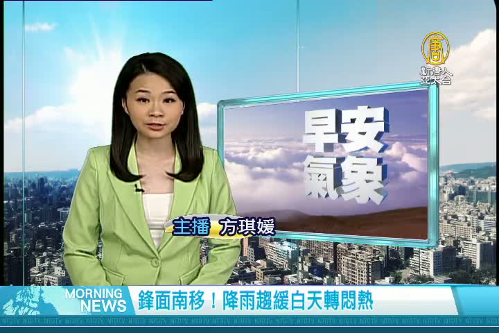 【新唐人亞太台 2017 年 05 月 17 日訊】歡迎您收看5月17日的早安新唐人,我是方琪媛。先來帶您關心今天的天氣情況。今天鋒面南移到巴士海峽,降雨將逐漸緩和,西半部平地,陽光有機會露臉,東半部及南部地區仍有局部短暫雨,而隨著降雨趨緩,各地高溫也將逐漸回升,中南部上看31、32度,北部也有29度,白天稍感悶熱。帶您一起來看到國際媒體重要訊息。
