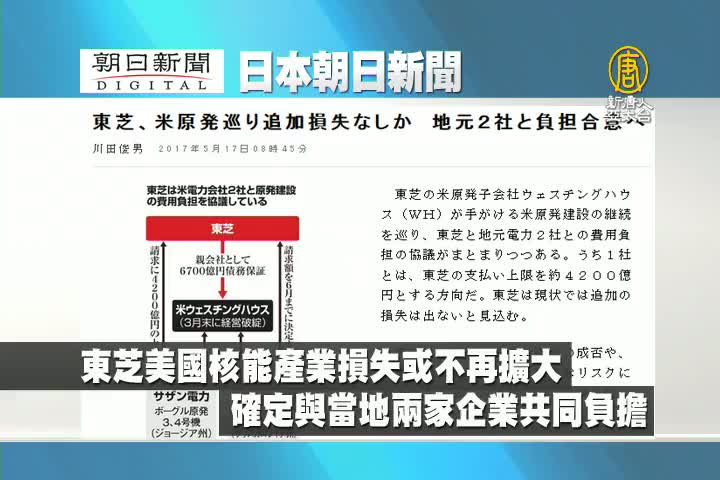 【新唐人亞太台 2017 年 05 月 18 日訊】來看到日本朝日新聞:東芝美國核能產業損失可能不會再擴大,確定與當地兩家企業共同負擔。