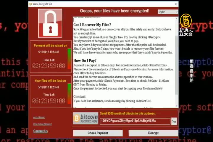 2017-05-15 07:20:41歡迎回來,勒索病毒WannaCry,12日起肆虐全球,防毒軟體公司表示,至少波及150個國家,超過20萬部電腦中標,包括俄羅斯、英國、美國以及台灣。美國總統川普下令國土安全顧問,召開緊急會議,評估威脅,並追查駭客身分。