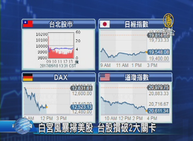 【新唐人亞太台 2017 年 05 月 18 日訊】美國總統川普陷入政治風暴,歐美股市,週三都大跌超過 1%,衝擊全球投資信心,亞股也跟跌,台股加權指數,萬點和9900點失守後再反彈回9950點之上。終場下跌44.22點,以9969.45點作收,成交值新台幣832.89億元。另外,新台幣匯率今天表現疲弱,終場以30.225元兌1美元作收,貶值8.5分,連續第二個交易日收貶。