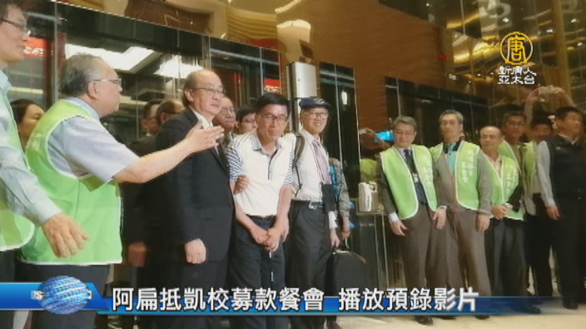 【新唐人亞太台 2017 年 05 月 19 日訊】歡迎回來,保外就醫的前總統陳水扁,今天晚間出席凱達格蘭基金會在台北大直典華飯店的舉辦的募款餐會,據了解,陳前總統已經在晚間7點半進入6樓,真正的會場在5樓,由於台中監獄開出了包括不准進入會場、不上台、不演講、不談政治及不接受媒體採訪的「五不」條件,現場播放阿扁的預錄影片,與現場近兩百桌的支持者見面。