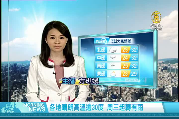 【新唐人亞太台 2017 年 05 月 22 日訊】歡迎您收看5月22日的早安新唐人,我是方琪媛。先來帶您關心今天的天氣情況。今天各地大多是多雲到晴的天氣,西半部感受會較為悶熱,全台高溫多在30度以上,午後中南部地區以及西半部山區有局部短暫雷陣雨,穩定的天氣將持續至星期二上半天,從明天下午開始,大氣狀況又會變得不太穩定帶您一起來看到國際媒體重要訊息。