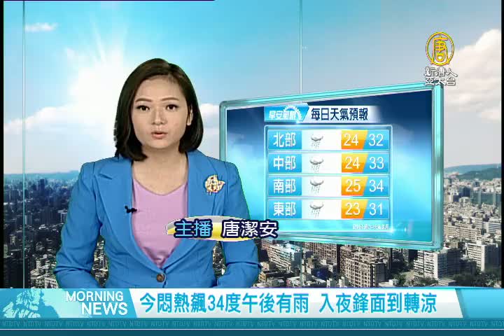 【新唐人亞太台 2017 年 05 月 23 日訊】歡迎您收看5月23日的早安新唐人,我是唐潔安。先來帶您關心今天的天氣情況。今天白天各地天氣大致穩定,山區降午後雷陣雨的機率提高。北部高溫30到32度,中南部高溫31到34,東部高溫30到31度,外島高溫27到30度。全台紫外線指數多在過量級,提醒您出門前務必要做好防曬、多補充水分,入夜後一波鋒面接近,天氣較不穩定,也會轉涼。帶您一起來看到國際媒體重要訊息。