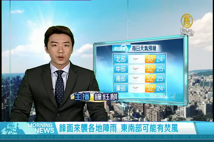 【新唐人亞太台 2017 年 05 月 24 日訊】歡迎您收看5月24日的早安新唐人,我是鐘鈺麒。先來帶您關心今天的天氣情況。受到鋒面影響,今天各地降雨機率將提高,氣溫也因降雨而微幅下滑,北部及東北部地區高溫約29、30度,中南部高溫約32度,而東南部有機會出現焚風,提醒當地民眾慎防高溫引發中暑,預計這波鋒面的影響會到星期四。帶您一起來看到國際媒體重要訊息。