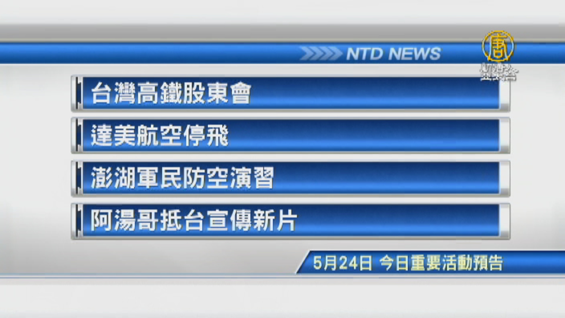 【新唐人亞太台 2017 年 05 月 24 日訊】接著看到,今天,5月24日,星期三 ,有哪些重要活動。台灣高鐵股東會;達美航空停飛;澎湖軍民防空演習;以及,阿湯哥、好萊塢影星湯姆克魯斯來台宣傳新片。