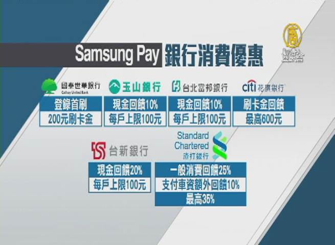 6大銀行針對Samsung Pay,加碼增列優惠活動,國泰世華登錄後首刷可拿200元刷卡金;玉山銀行、台北富邦銀行,現金回饋10% (每戶上限$100元);花旗則是最高600元刷卡金回饋;台新與渣打銀行則出手最大方,台新現金回饋20%(每戶上限100元);渣打銀行一般消費回饋 25%,支付車資額外回饋 10%,最高達35%。