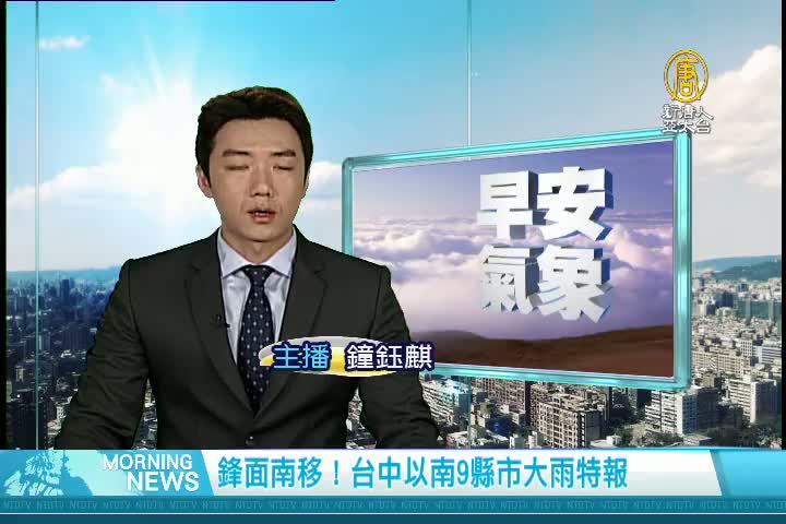 【新唐人亞太台 2017 年 05 月 25 日訊】歡迎您收看5月25日的早安新唐人,我是鐘鈺麒。先來帶您關心今天的天氣情況。受到滯留鋒面往南移動影響,今天北部平地降雨可望趨緩,不過氣象局針對台中以南等9縣市,發布大雨特報。 氣溫方面,北部及宜花地區高溫下降到25、26度左右,中南部及台東高溫也下降到27度至29度。提醒您最近外出都要攜帶雨具。帶您一起來看到國際媒體重要訊息。