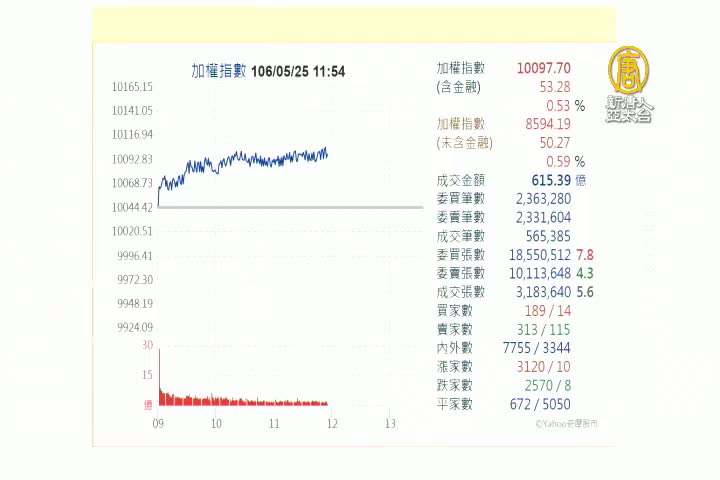 【新唐人亞太台 2017 年 05 月 25 日訊】美國股市連續5個交易日上揚走高,台股今天也是百花齊放,股匯齊揚,台積電上漲領軍,加上電金聯手合擊,帶動加權指數在盤中衝上1萬100點,改寫17年新高紀錄。