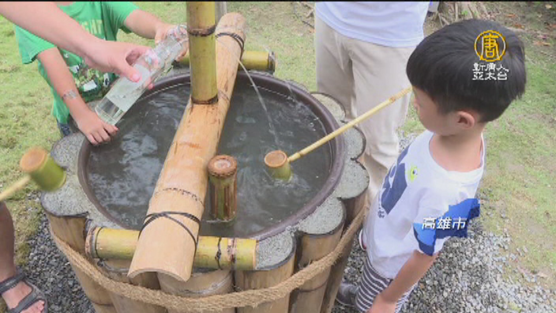 竹管噴出小水柱,匯集在下方的水盆裡,可以用接的,也可以用舀的,這是高雄壽山國家自然公園籌備處,和柴山會合作,在端午節這幾天連假,推出的取午時水活動。