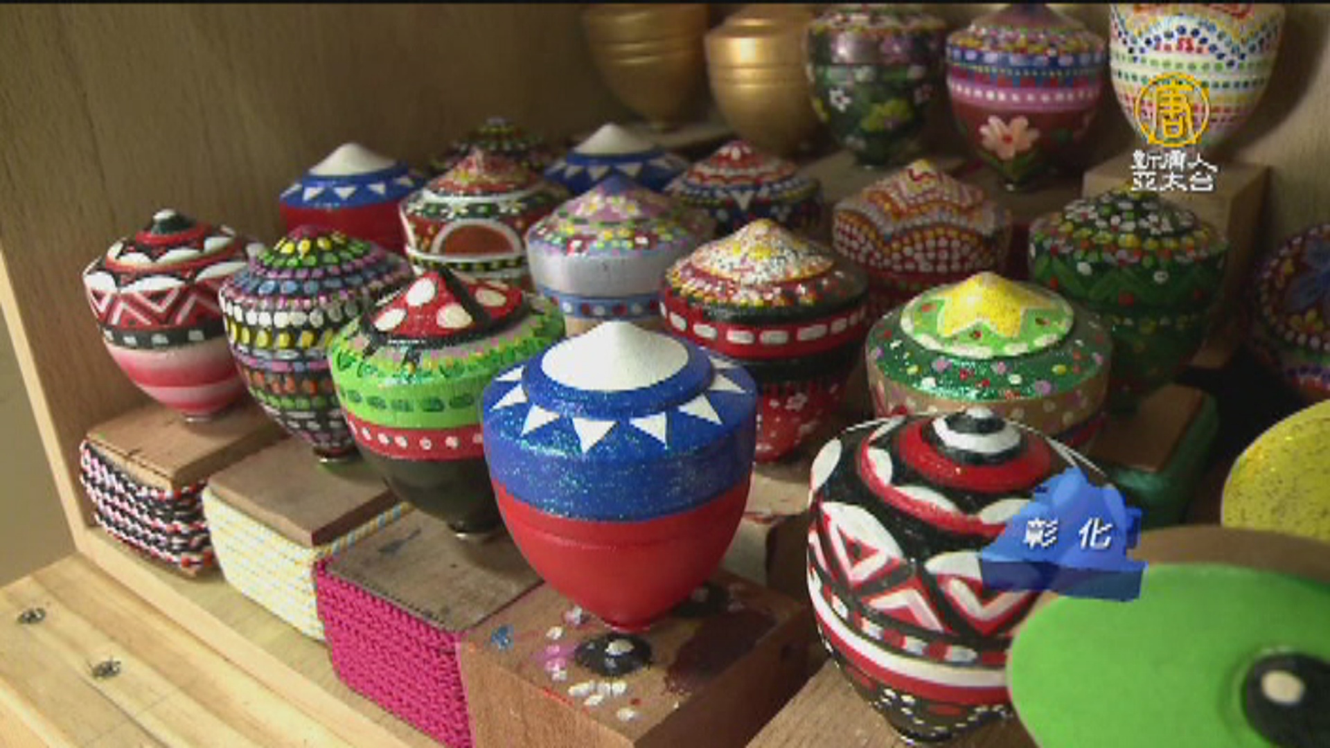 各式各樣、七彩顏色的陀螺,很吸引目光,小朋友在地上就玩了起來,還有小朋友敲敲打打,DIY自己喜愛的玩物,也有的認真塗抹,端午節連假,鹿港藝術村桂花巷 充滿前來體驗的親子人潮。