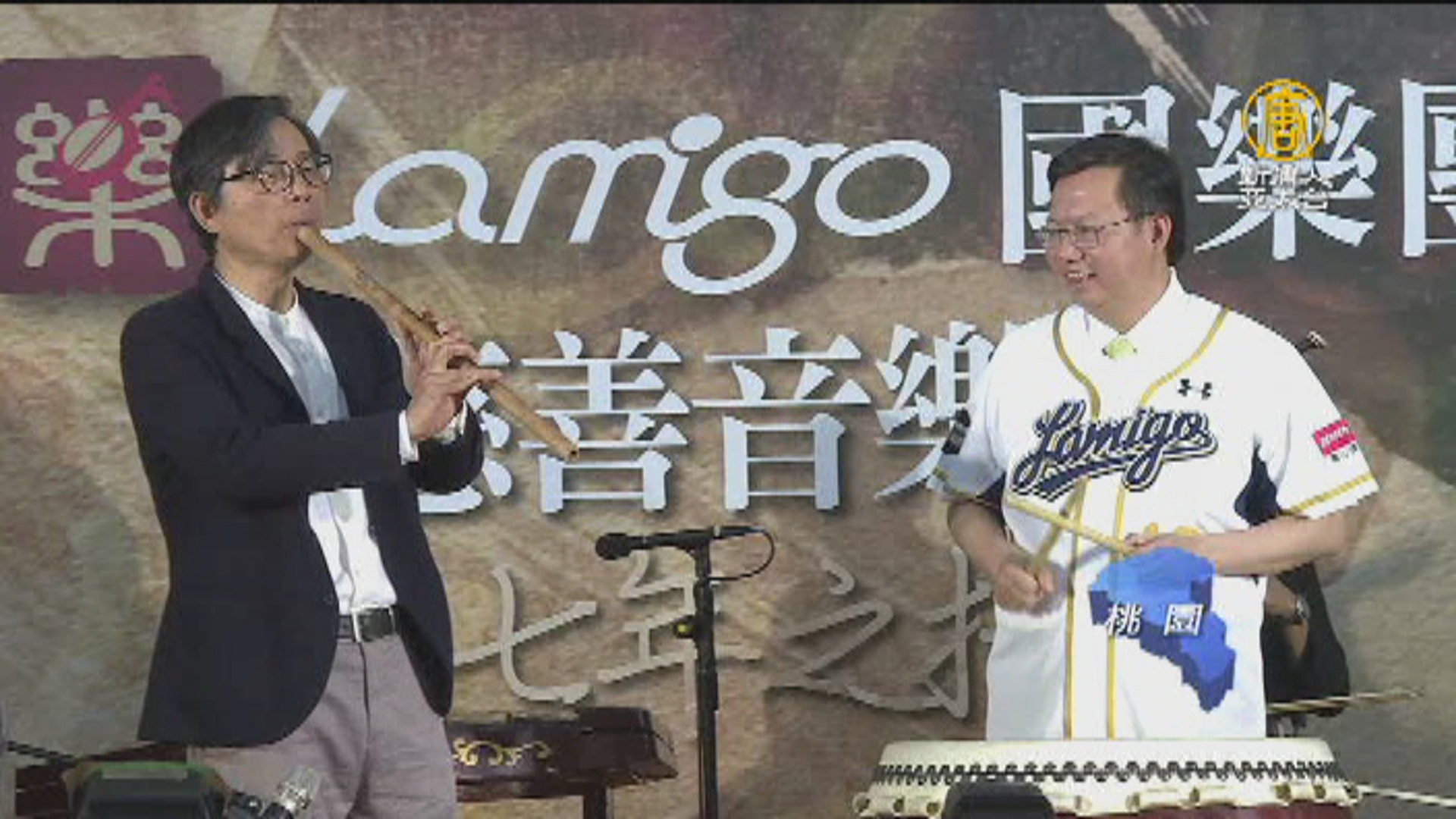 一個打鼓,一個吹簫,桃園市長鄭文燦和La new集團董事長劉保佑,與Lamigo國樂團同台演奏,為7月12日在桃園中壢藝術館,舉行的Lamigo國樂團慈善音樂會拉開序幕。