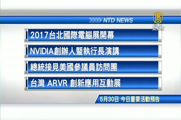 【新唐人亞太台 2017 年 05 月 30 日訊】接著看到,今天,5月30日,星期二 ,有哪些重要活動。首先是,2017 COMPUTEX台北國際電腦展開幕;繪圖晶片大廠輝達執行長,發表主題演說;總統接見美國參議院外委會亞太小組主席,賈德納訪問團;以及國發會舉辦,台灣 ARVR 創新應用互動展。