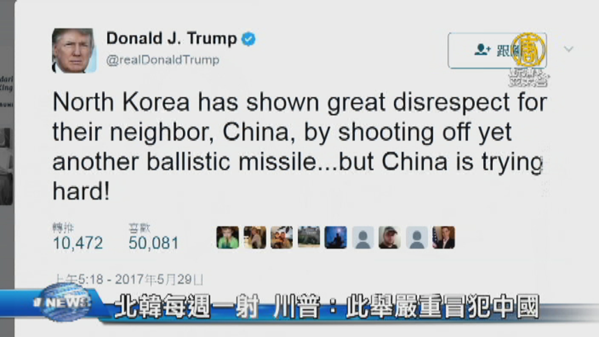 北韓每週一射 川普:此舉嚴重冒犯中國