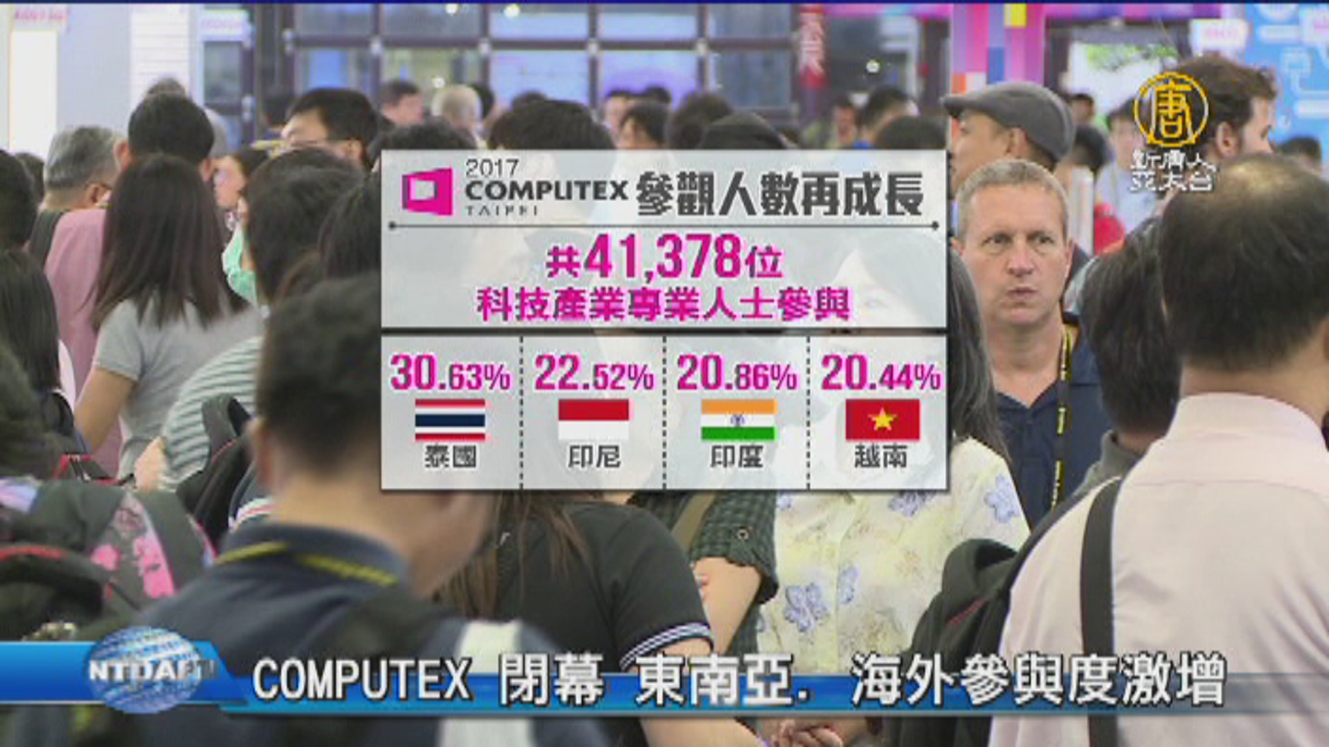 【新唐人亞太台 2017 年 06 月 03 日訊】2017台北國際電腦展今天閉幕,今年有多達4萬多名科技產業專業人士參加,參觀者數量不僅成長,自東南亞包括泰國、越南、印度等地的人數也激增,主辦單位貿協表示,未來將擴大海外新創團隊公司參展比例,加深與國際市場接軌。