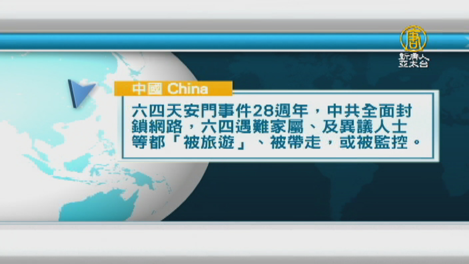 六四天安門事件28週年,中共全面封鎖網路,六四遇難家屬、及異議人士等都「被旅遊」、被帶走,或被監控。