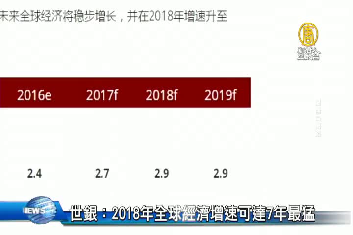 【新唐人亞太台 2017 年 06 月 05 日訊】世界銀行最新《全球經濟展望報告》出爐,4年來第1次沒有出現調降的壞消息,而是維持,年度經濟成長預測2.7%,2018到2019年的經濟成長率,更可望達到2.9%。報告指出,全球貿易成長,出現自後金融危機時期的低位反彈,應能刺激明年全球經濟,以近 7 年來最快的步伐成長。