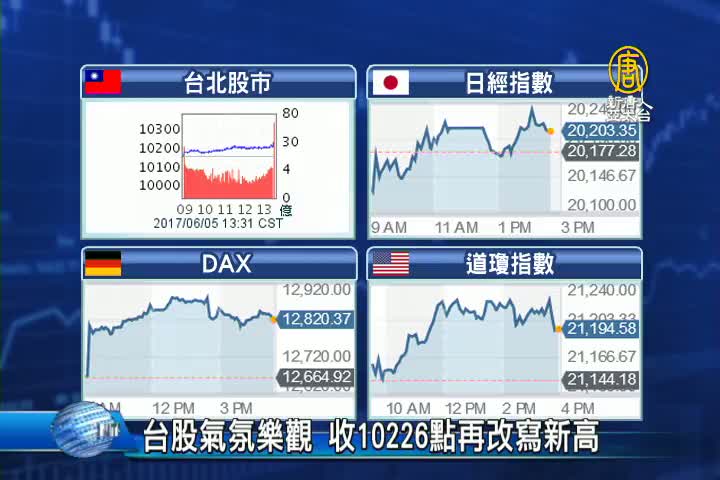 【新唐人亞太台 2017 年 06 月 05 日訊】財經消息,先來看到,上週六,台股獨家,開市雖然指數收紅,但是少了外資的挹注,市場量能偏低。今天內外資回流,成交量恢復正常,大型股與中小型股各自表現,大盤緩步墊高,尾盤拉升收高上漲 68 點,以 10226 點作收,又刷新紀錄,成交量則是 926 億元。本周在那斯指數創高、美國ISM製造業指數、ADP就業人數,都優於預期等利多帶動下,預期台股將維持震盪盤堅格局。