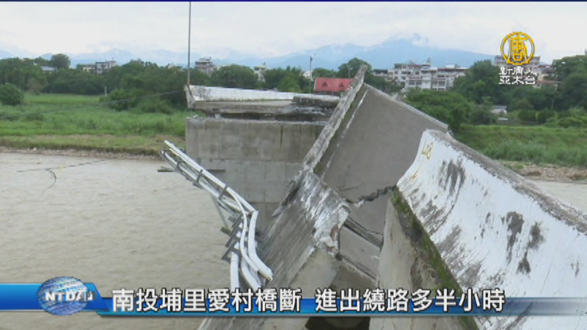 【新唐人亞太台 2017 年 06 月 05 日訊】埔里鎮愛蘭地區民眾通行的重要橋梁之一的愛村橋,因最近連日豪大雨,南港溪水暴漲愛村橋被沖斷,原本鎮內到台中只需要幾分鐘車程,現在居民進出及農產運輸都要改道,繞路需多花半小時車程。