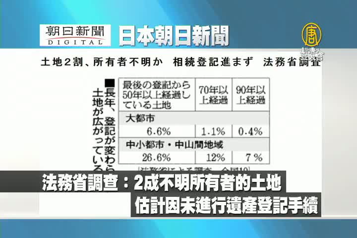【新唐人亞太台 2017 年 06 月 07 日訊】來看到日本朝日新聞:日本法務省調查顯示,全國有2成不明所有者的土地,估計是沒有進行遺產登記手續。
