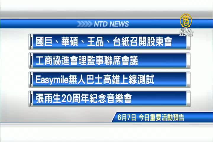 【新唐人亞太台 2017 年 06 月 07 日訊】接著看到,今天,6月7日,星期三 ,有哪些重要活動。首先是,國巨、華碩、王品、台紙召開股東會;工商協進會理監事聯席會議;Easymile無人巴士高雄上線測試 ;以及,張雨生20周年紀念音樂會,在澎湖舉行。
