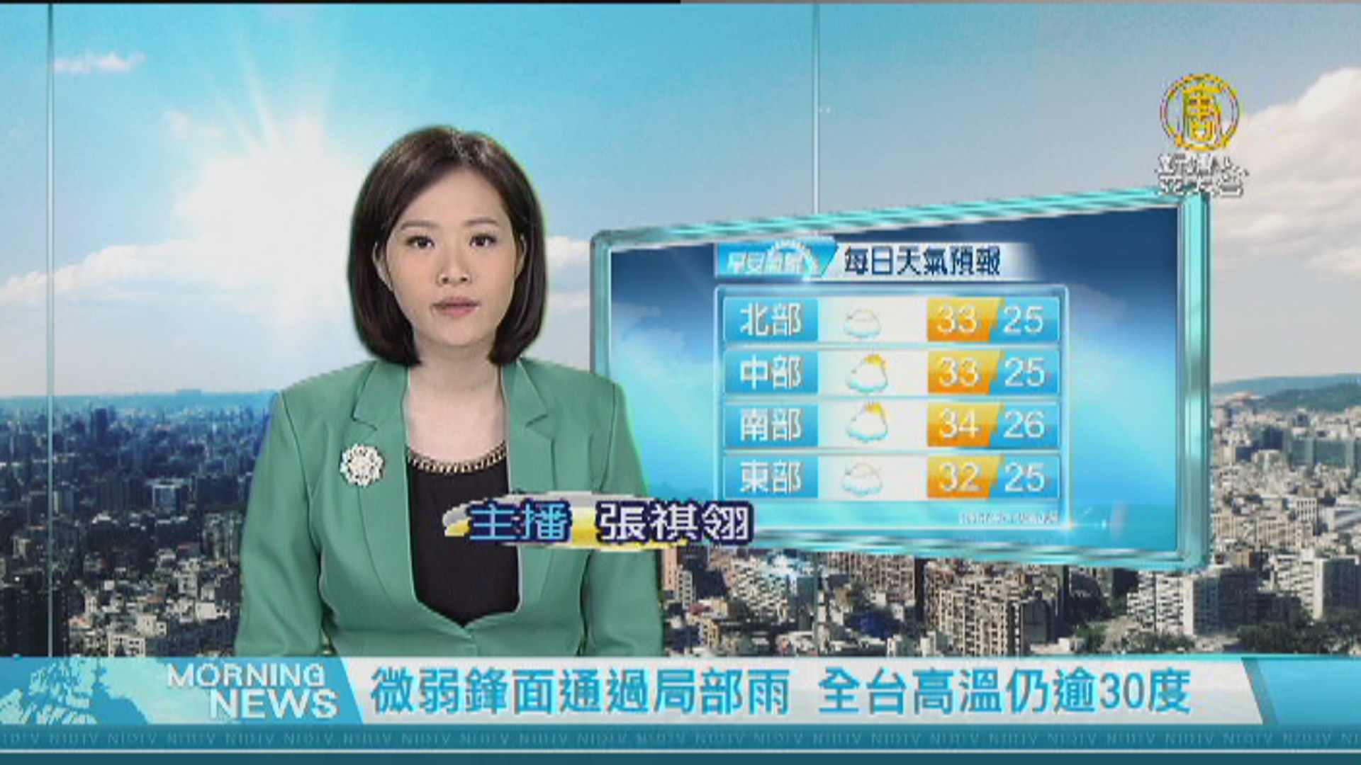 【新唐人亞太台 2017 年 06 月 08 日訊】歡迎您收看6月8日的早安新唐人,我是張祺翎。先來帶您關心今天的天氣情況。受到微弱鋒面通過北部海域影響,今天北海岸及東半部地區可能有短暫陣雨,其他地區大多是多雲時晴。悶熱的感覺會稍微舒緩,不過全台高溫都在31度以上,屏東可能出現34度的高溫,還是要適時補充水分。帶您一起來看到國際媒體重要訊息。