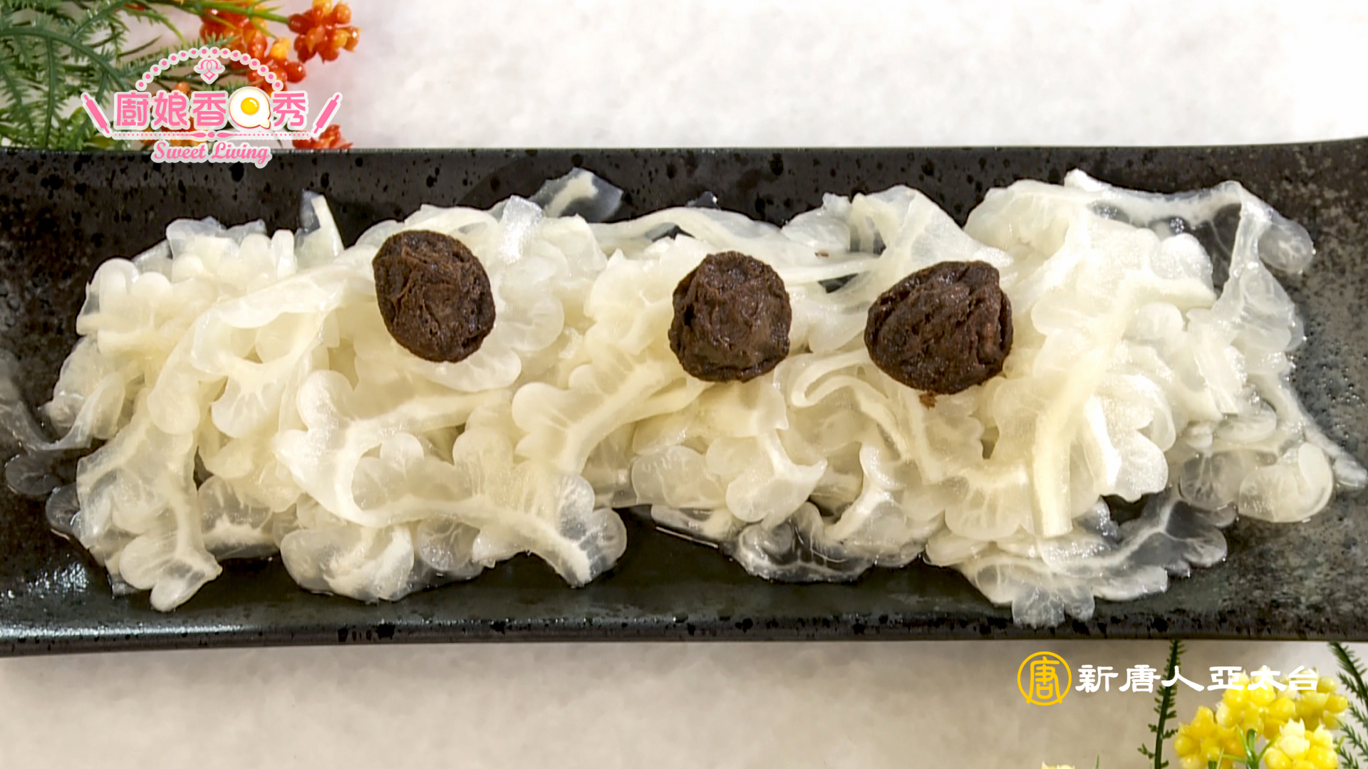來賓彭成華秉著健康飲食新觀念,分享工序不繁複,但卻要完全慢工才能出美味的筍乾黃豆,以及用當令食材,完成不用油的冷拌菜白玉苦瓜