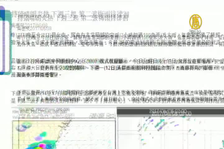 【新唐人亞太台 2017 年 06 月 08 日訊】來關心天氣,氣象局表示,今天到週日,各地將維持多雲到晴的天氣,高溫大多在31到35度之間,山區午後要注意局部短暫雷陣雨。不過,氣象專家吳德榮提醒,從下週三到週六,又有滯留鋒面徘徊台灣上空,鋒面前伴隨西南氣流,恐怕又有「第二波」典型致災的梅雨鋒面報到,要大家不要掉以輕心。