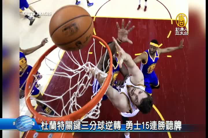 【新唐人亞太台 2017 年 06 月 08 日訊】NBA總冠軍賽第三戰,勇士隊今天作客騎士隊主場,勇士隊杜蘭特最後一分鐘連切帶罰,連得5分,尤其倒數45秒的關鍵三分球,助第四節陷入苦戰的勇士反超比分,終場就以 118:113 擊敗騎士隊,在總冠軍賽七戰四勝中,取得3連勝聽牌局面,勇士隊也創下季後賽15連勝佳績。