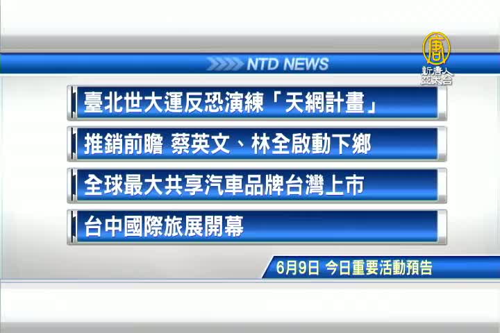【新唐人亞太台 2017 年 06 月 09 日訊】接著看到,今天,6月9日,星期五 ,有哪些重要活動。首先是,臺北世大運反恐演練「天網計畫」;再來是,推銷前瞻基礎建設計畫, 蔡英文、林全今天分別啟動下鄉遊說;財經方面,全球最大共享汽車品牌來台上市;以及,台中國際旅展開幕。