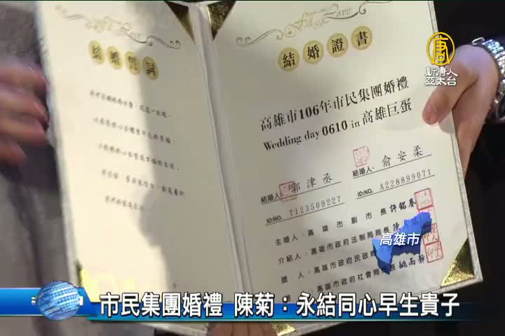 【新唐人亞太台 2017 年 06 月 10 日訊】想要辦一場與眾不同的婚禮又不想花大把鈔票,報名市民集團婚禮是個好選擇,今天(10日)有150對新人開心參加高雄市民集團婚禮,市長陳菊雖然遠在美國西雅圖,現場也播放預錄好的影片,視訊祝賀新人永結同心,早生貴子。