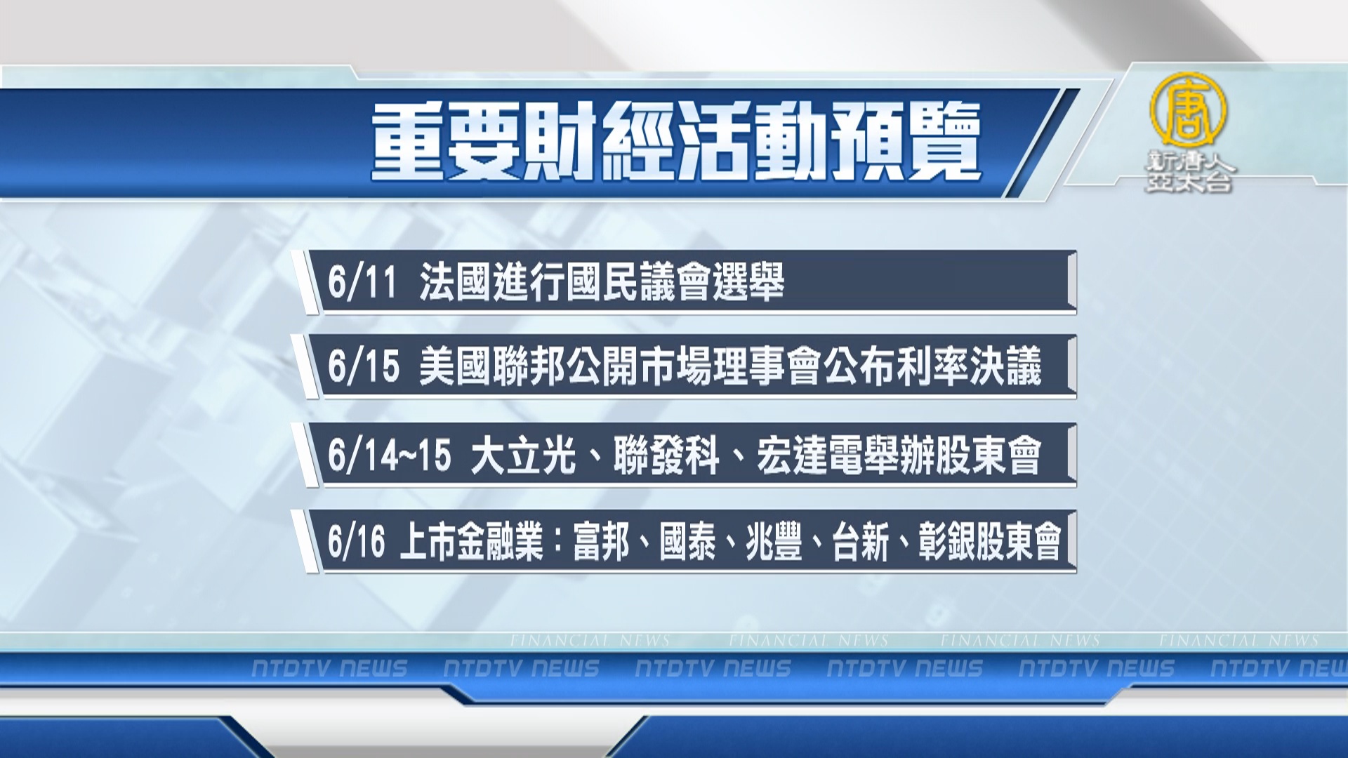 【新唐人亞太台 2017 年 06 月 11 日訊】帶您看到下週,有哪些重要的財經活動。