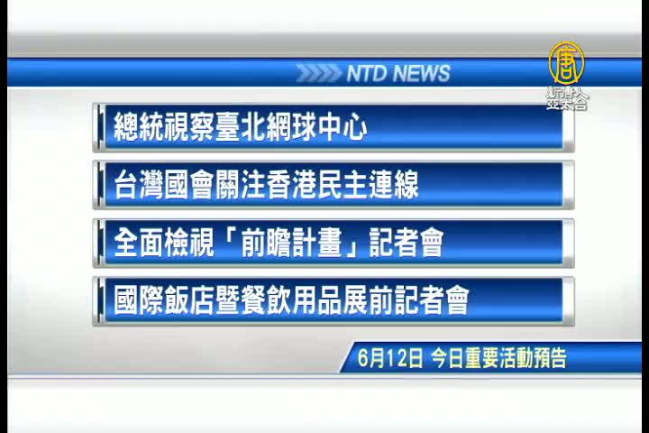 【新唐人亞太台 2017 年 06 月 12 日訊】接著看到,今天,6月12日,星期一 ,有哪些重要活動。首先是,總統蔡英文視察「台北市網球中心」;立法院成立「台灣國會,關注香港民主連線」;前國策顧問郝明義,全面檢視「前瞻計畫」記者會;以及《台灣國際飯店暨餐飲設備用品展》展前記者會。