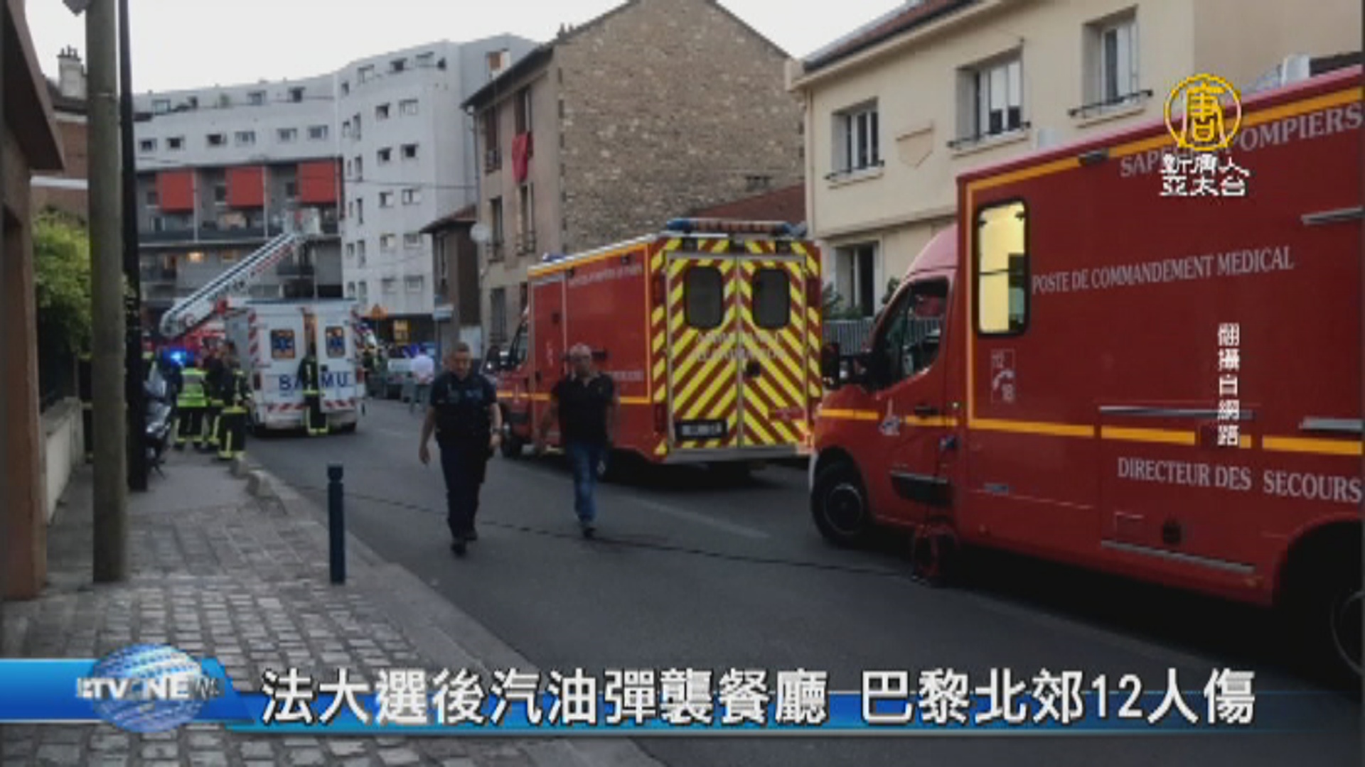 【新唐人亞太台 2017 年 06 月 12 日訊】好,法國總統馬克宏,執政一個月以來,受到法國民眾愛戴,但歐洲仍舊不安穩,就在國會大選完之後,法國周日晚間約8時30分,位在首都巴黎北部市郊的一家餐廳,遭人丟擲汽油彈,餐廳瞬間燒起大火,造成12人燒傷,其中2人有生命危險。法國警方初步判定這是一起搶劫事件,與恐怖攻擊無關。