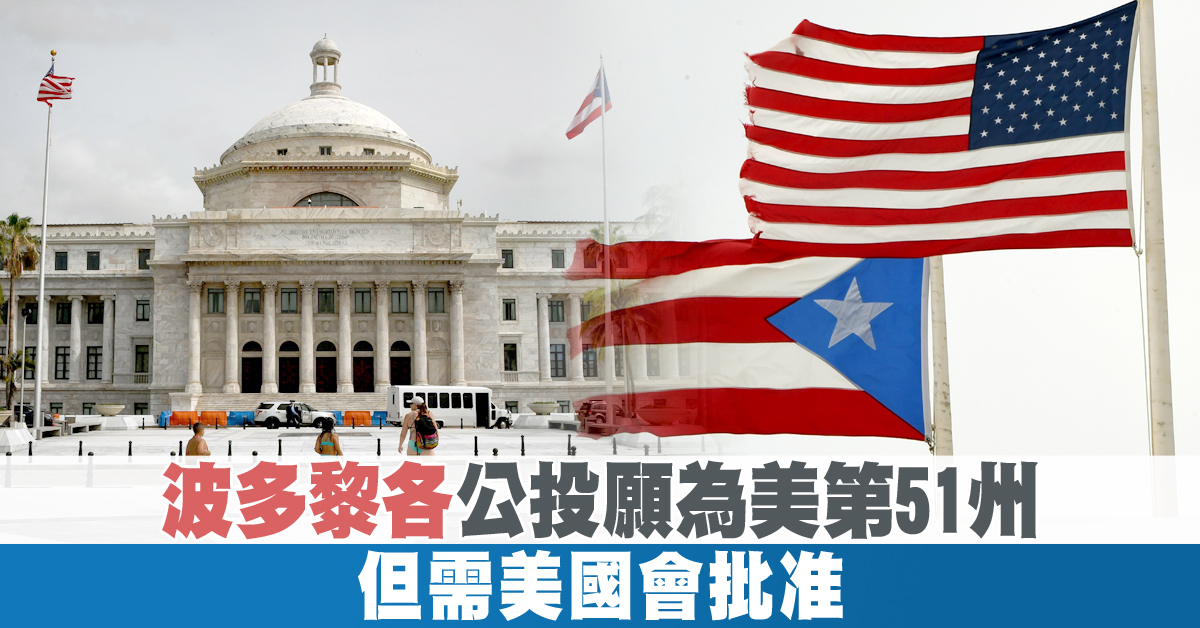 位於加勒比海的波多黎各島,在當地時間11日,針對與美國之間的地位關係,舉行第五次全民公決。結果顯示,絕大多數人贊成向美國國會申請「成為美國的第51個州」。但公投結果無法律約束力,且需要美國國會批准。