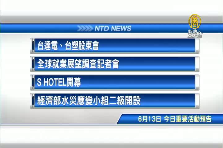【新唐人亞太台 2017 年 06 月 13 日訊】接著看到,今天,6月13日,星期二 ,有哪些重要活動。首先是,台達電、台塑股東會;全球就業展望調查記者會;汪小菲投資S HOTEL開幕;以及經濟部水災應變小組、中央應變中心二級開設。