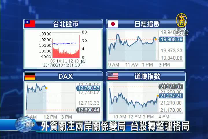 【新唐人亞太台 2017 年 06 月 13 日訊】巴拿馬宣布與中國建交,總統府表示將重新評估兩岸情勢。市場關注,是否影響外資對台股的風險評估。不過今天的台股,主要還是受到美國科技股週一續跌的影響,今天開盤小跌後,在電子、傳產、金融股,都有權值股大將,單兵點火 帶動,月線明顯成為強撐。收盤上漲18點,收在10128點,成交值新台幣794.33億元。另外,新台幣匯價今天開低走低,終場以30.227元兌1美元作收,貶值5.1分,匯價連六貶,並創下1個月來新低。