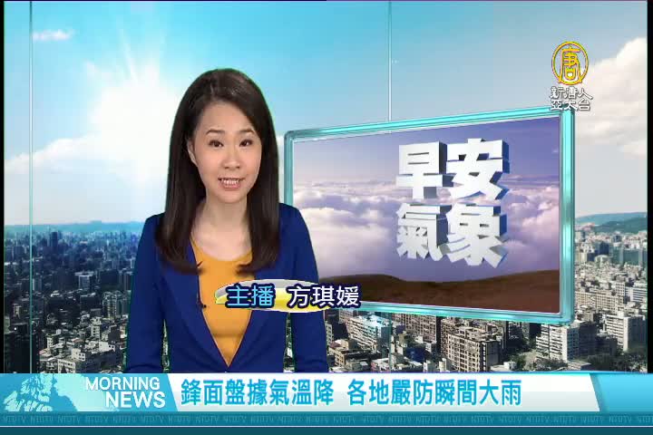 【新唐人亞太台 2017 年 06 月 15 日訊】歡迎您收看6月15日的早安新唐人,我是方琪媛。先來帶您關心今天的天氣情況。今天持續受到鋒面和西南氣流影響,尤其得留意,鋒面附近容易有雷雨胞發展,可能會有瞬間大雨、雷擊及強陣風等現象,且隨著鋒面的移動,瞬間大雨的位置也會跟著移動,提醒民眾出門,一定要記得攜帶雨具。帶您一起來看到國際媒體重要訊息。