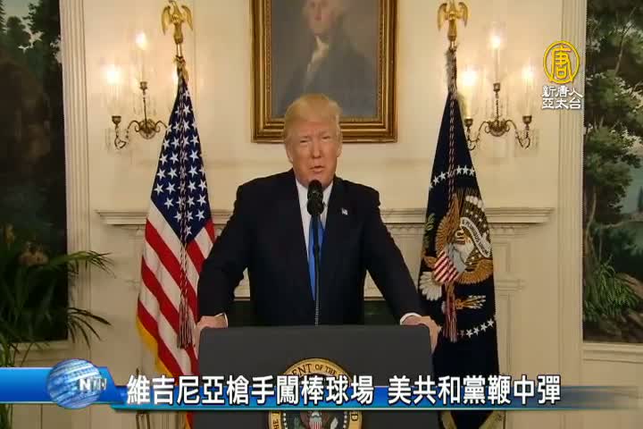 【新唐人亞太台 2017 年 06 月 15 日訊】新聞首先來看到,美國維吉尼亞州國會棒球隊練習期間,傳出槍響,美國共和黨眾議院黨鞭史卡利塞 等5人中彈,所幸都沒有生命危險,美國總統川普對此表示悲痛,而他和彭斯隨後的行程也被取消,川普並在白宮記者會上表示,「兇嫌已在和警方交火時,受傷死亡」。這起事件發生在當地時間上午7點多,槍手連開50到100槍後,才被警方制伏身亡。警方表示,嫌犯是66歲的男子霍奇金森,犯案動機仍在調查當中。