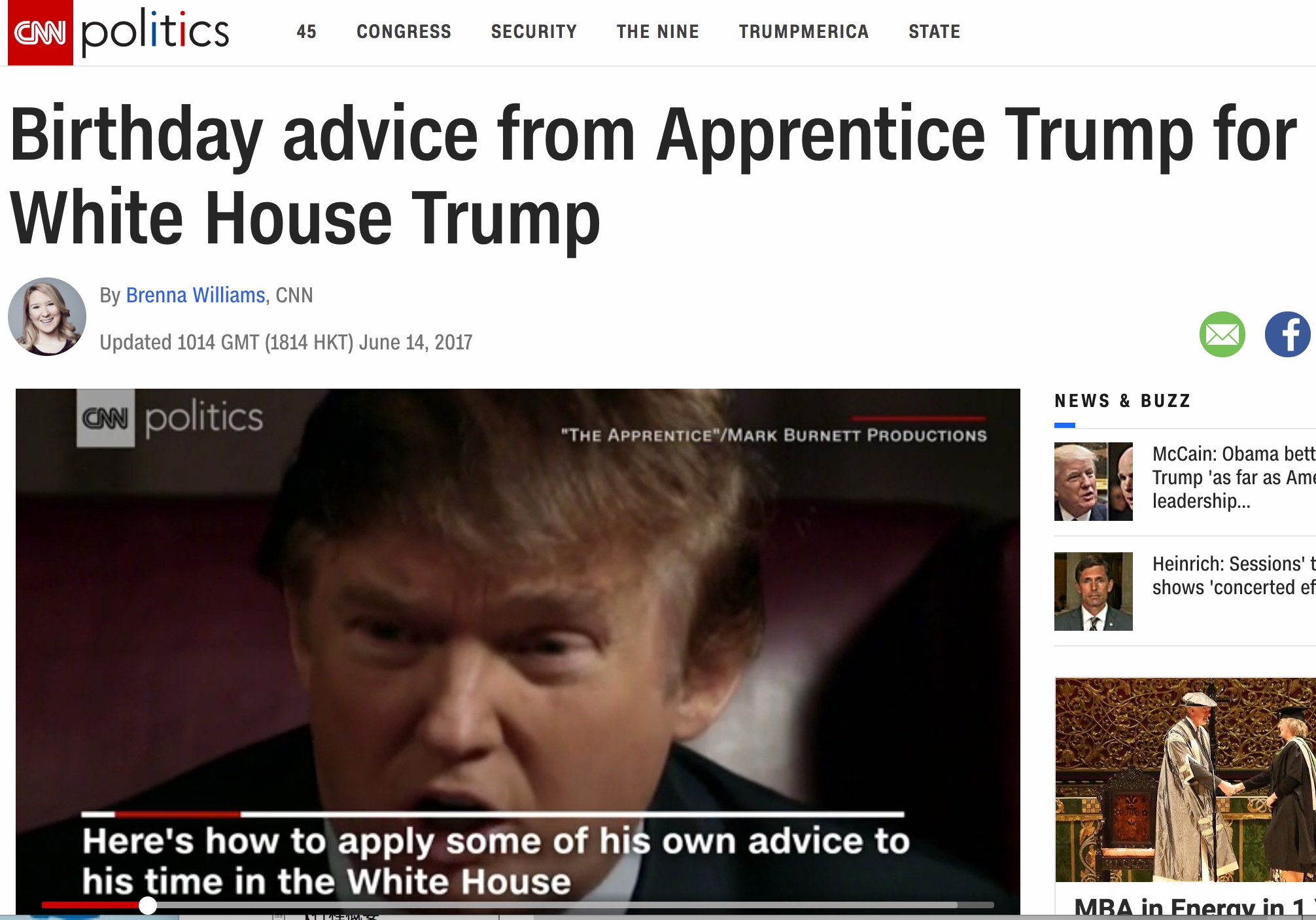 【新唐人亞太台 2017 年 06 月 15 日訊】週三(6月14日)是美國總統川普(特朗普)的71歲大壽,也是他入主白宮後的第一個生日。CNN特別回顧川普數十年來與公眾分享的人生智慧,並對比白宮川普的行事風格。