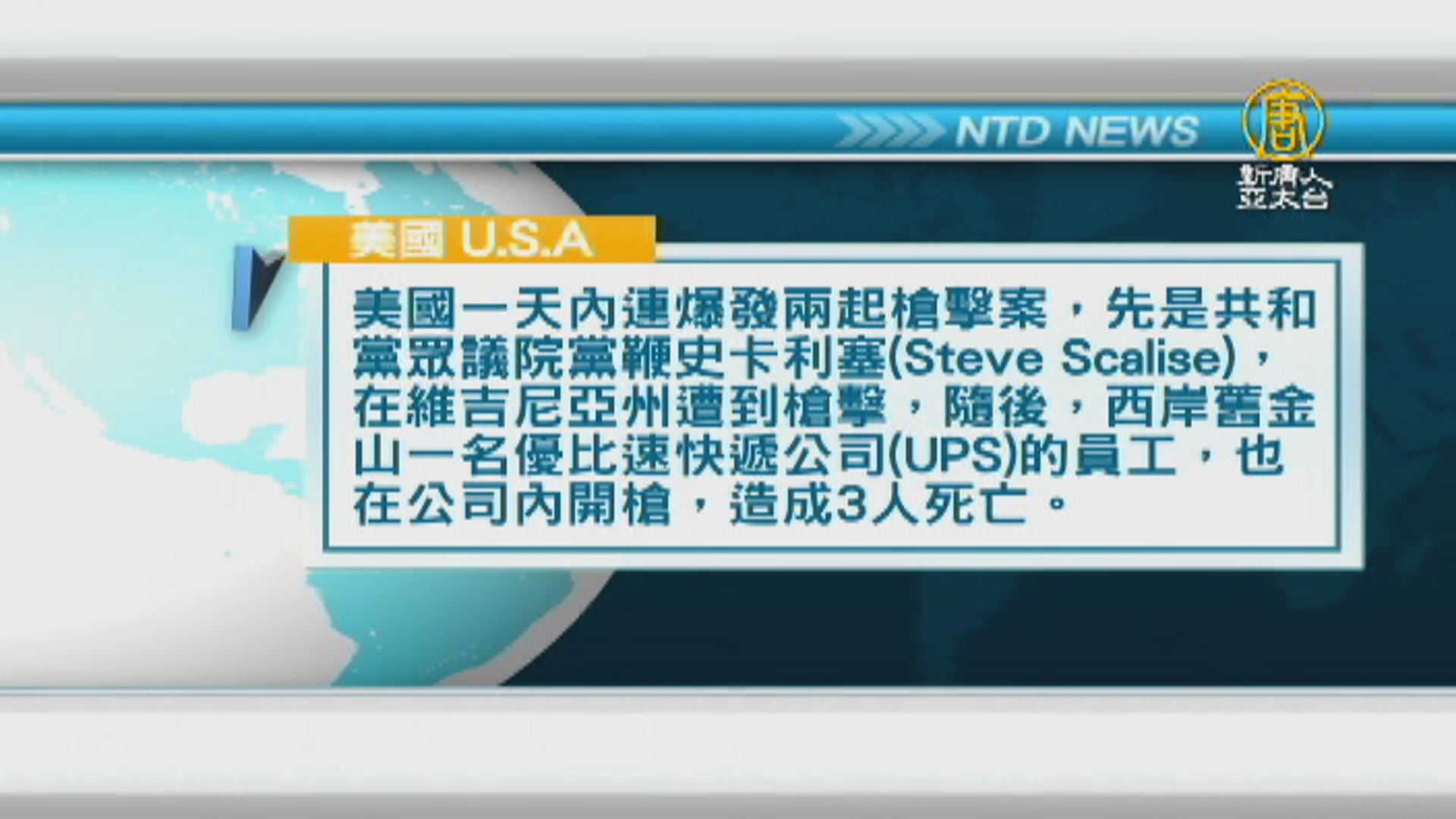 美國一天內連爆發兩起槍擊案,先是共和黨眾議院黨鞭史卡利塞(Steve Scalise),在維吉尼亞州遭到槍擊,隨後,西岸舊金山一名優比速快遞公司(UPS)的員工,也在公司內開槍,造成3人死亡。