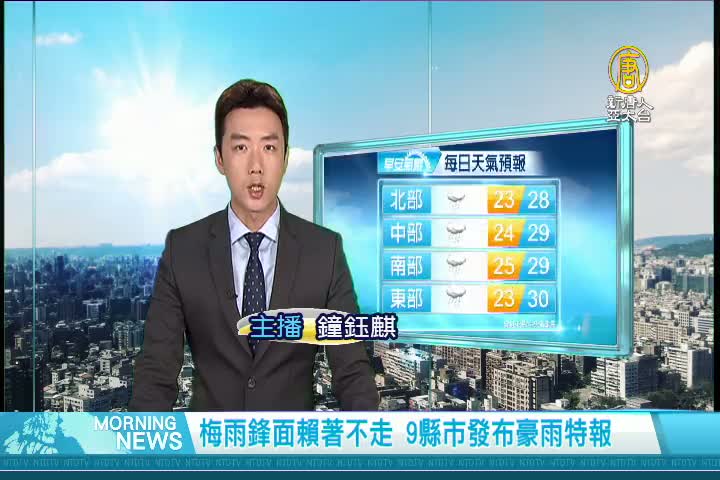 【新唐人亞太台 2017 年 06 月 16 日訊】歡迎您收看6月16日的早安新唐人,我是鐘鈺麒。先來帶您關心今天的天氣情況。今天鋒面略往北移,中部以北會有明顯雨勢,南部受西南氣流影響,下雨時間也相當長,西半部更是有豪雨以上等級降雨機率,提醒民眾,要注意瞬間大雨、雷擊及強陣風,山區請慎防坍方、落石及溪水暴漲。帶您一起來看到國際媒體重要訊息。