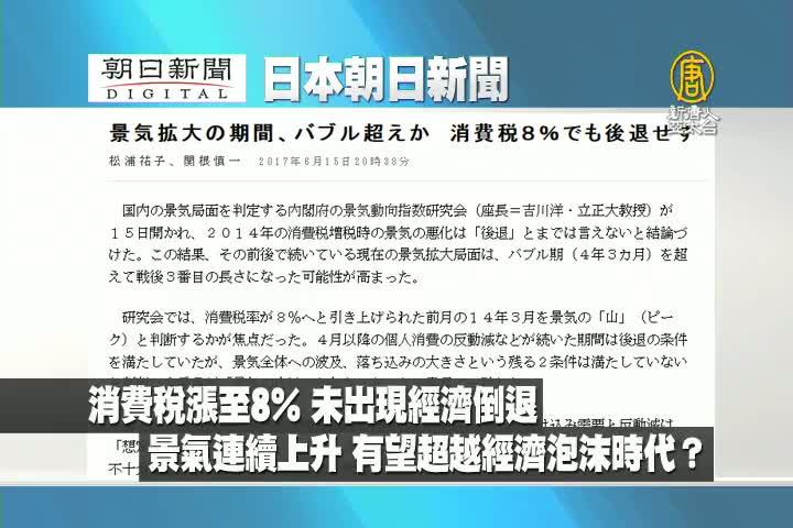 【新唐人亞太台 2017 年 06 月 16 日訊】來看到日本朝日新聞:日本消費稅上漲至8%後,沒有出現經濟倒退,景氣連續上升期間有望超越經濟泡沫時代?