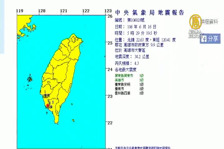 【新唐人亞太台 2017 年 06 月 16 日訊】歡迎回來。南台灣今天清晨發生一起有感地震,芮氏規模達4.3。在清晨5時29分,震央在高雄市大寮區,震源深度34.2公里,最大震度3級,在高雄市和屏東市。