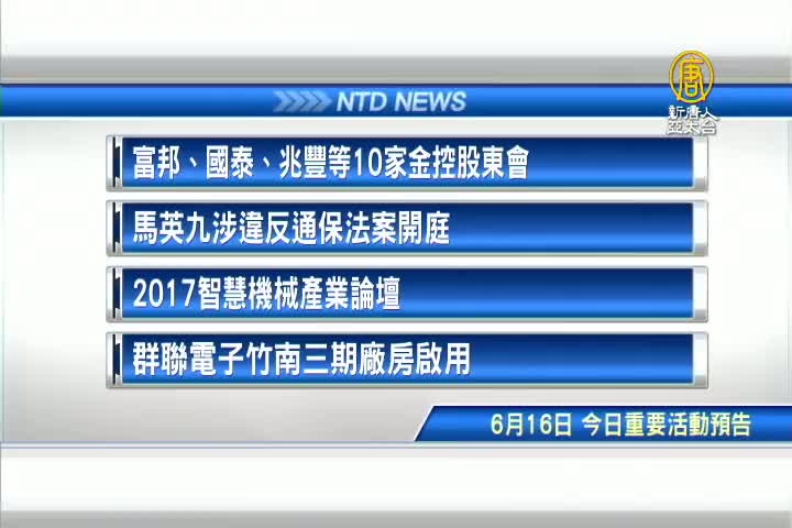 【新唐人亞太台 2017 年 06 月 16 日訊】接著看到,今天,6月16日,星期五 ,有哪些重要活動。首先是,富邦、國泰、兆豐等10家金控超級股東會登場;前總統馬英九,涉嫌違反通保法開庭;2017智慧機械產業論壇;以及群聯電子竹南三期廠房啟用。